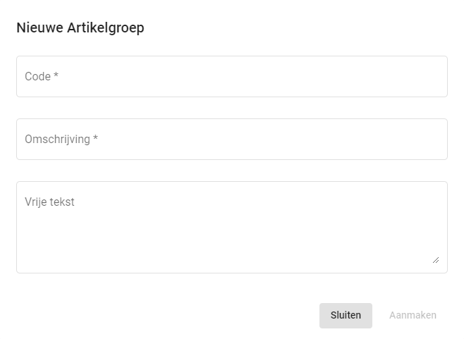 Met de oranje actie-knop is het mogelijk om een nieuwe artikelgroep toe te voegen aan de lijst. Hiermee wordt een pop-up venster geopend genaamd ‘Nieuwe Artikelgroep’. Hier kan ingevuld worden: Code*, Omschrijving*, Vrije tekst. De velden met een ‘*’ zijn verplichte invulvelden.