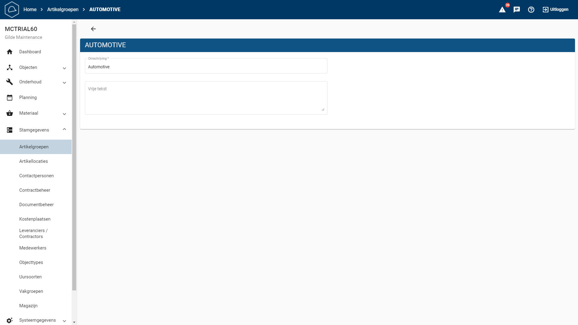 Op het detailscherm van een artikelgroep kunt u vrije tekst toevoegen of de omschrijving van de artikelgroep wijzigen.