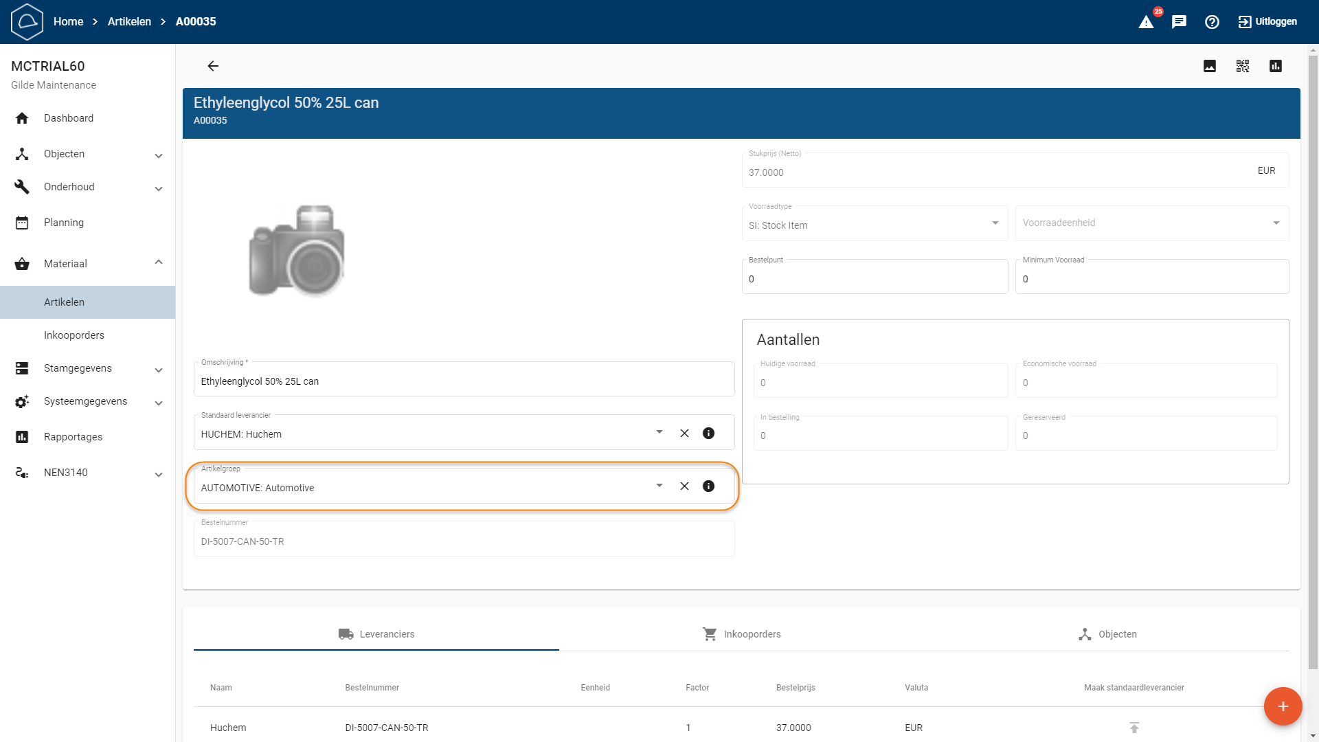 Een artikel kan toegewezen worden aan een artikelgroep op het detailscherm van een artikel. Navigeer naar ‘Materiaal’ > ‘Artikelen’ en dubbelklik op een artikel, of klik eenmaal op een artikel en klik vervolgens op de "Meer Details"-knop in het previewscherm.