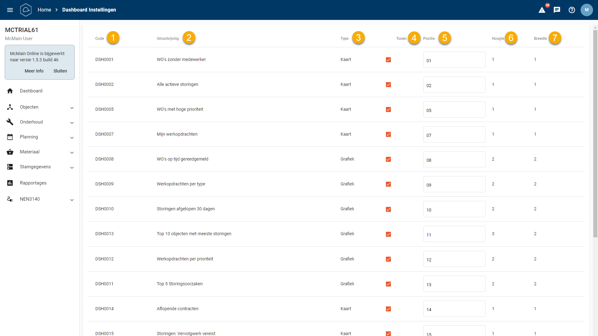 Je bevindt je nu in het 'Dashboard Instellingen' menu, waar je een tabel ziet met zeven kolommen: