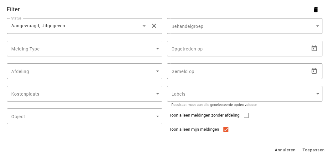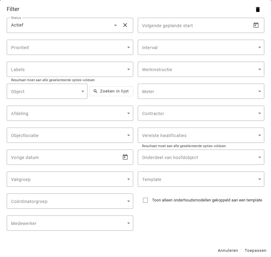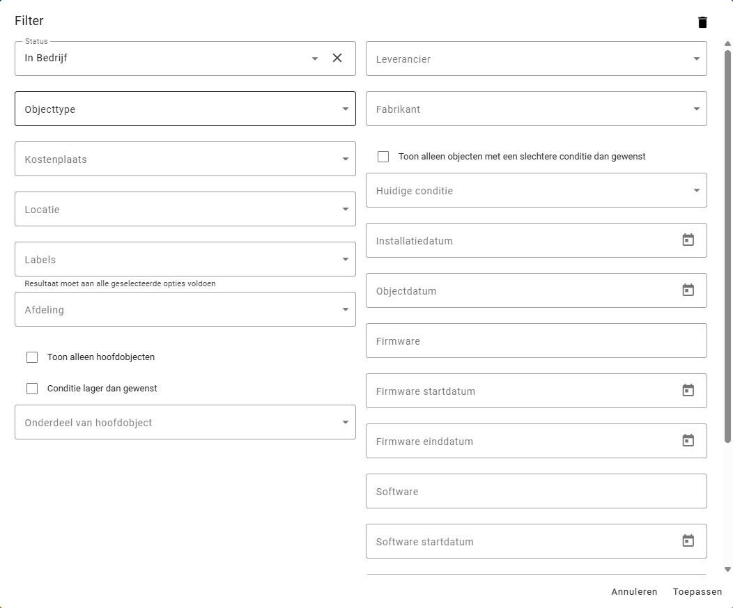 Om de vele objecten en werkopdrachten overzichtelijk te houden is een filterfunctie aan McMain Online toegevoegd. De filterfunctie is te vinden onder de filter knop. Wanneer je op deze knop klikt, opent het filter scherm. Filteropties verschillen per onderwerp. Hieronder zijn vier voorbeelden van verschillende filtermogelijkheden te vinden op basis van de verschillende schermen in het systeem.