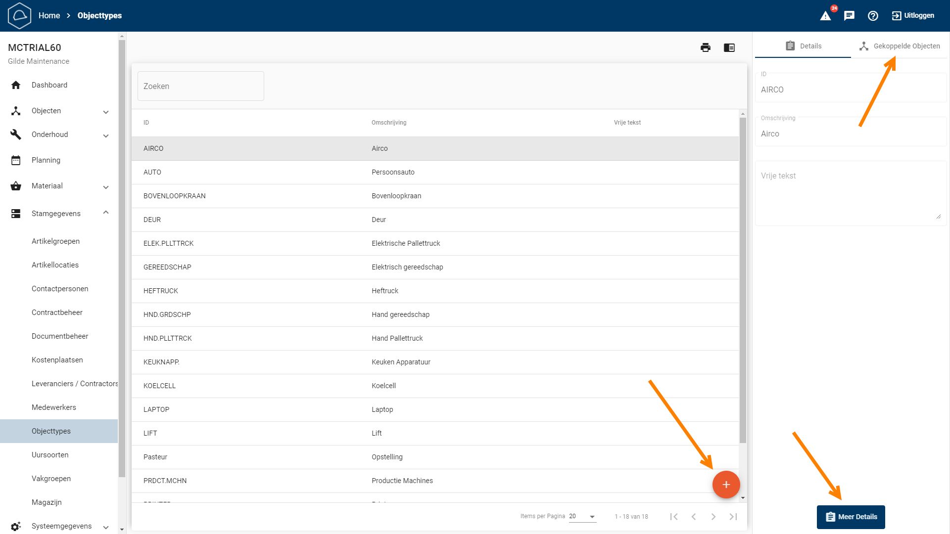 Aanmaken (Oranje ‘+’ actieknop): Hiermee maak je een nieuw objecttype aan.