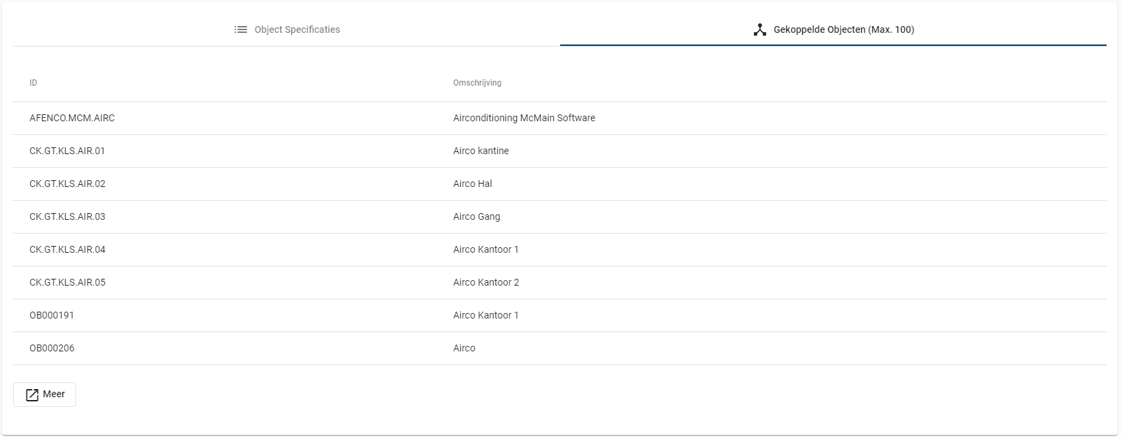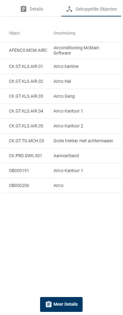 Bij het tabblad gekoppelde objecten is het mogelijk om de objecten in te zien welke gekoppeld zijn aan het gekozen objecttype. In onderstaande afbeelding zien we bijvoorbeeld alle Airco's.