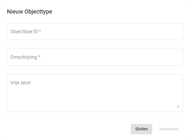 Het is mogelijk om door middel van de oranje ‘+’ actieknop rechts onderin het scherm een nieuw objecttype aan te maken. Daarmee opent het pop-up scherm ‘Nieuw Objecttype’. Deze heeft de volgende invulvelden: Objecttype ID*, Omschrijving* en Vrije tekst. Invulvelden met ‘*’ zijn verplichte invulvelden.