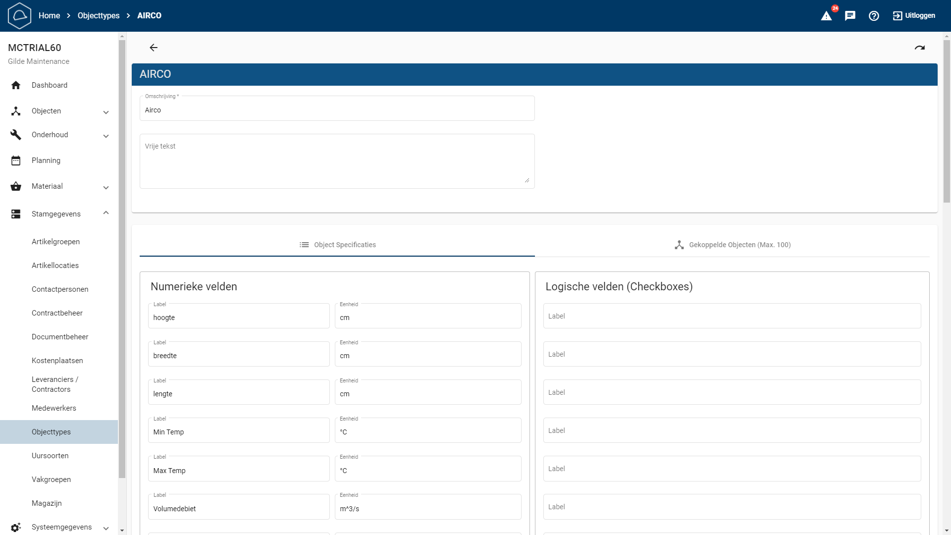 Bij "Object specificaties" kun je extra technische specificaties toevoegen, zoals numerieke velden, logische velden, tekstvelden en datumvelden.