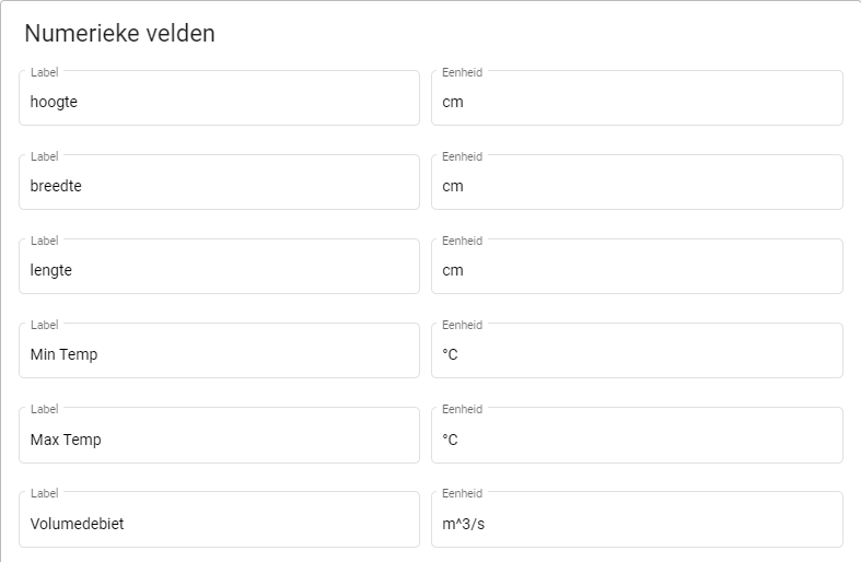 Numerieke velden zijn bedoelt om specificaties op te noemen waarbij een cijfer en een eenheid van toepassing is. Denk hierbij aan temperatuur (°C), Tijd (Sec) of Snelheid (m/s).