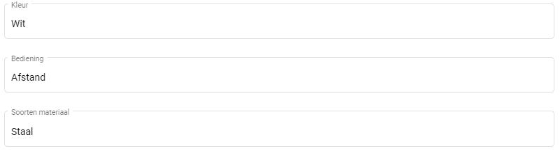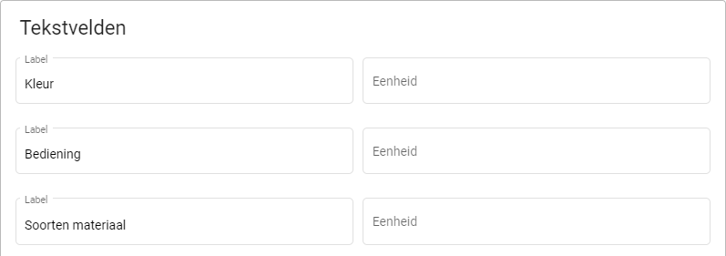 Tekstvelden zijn bedoelt om specificaties op te noemen waarbij een open antwoord van toepassing is. Deze onderdelen beschrijven het object. Denk hierbij aan de kleur of soort materiaal.