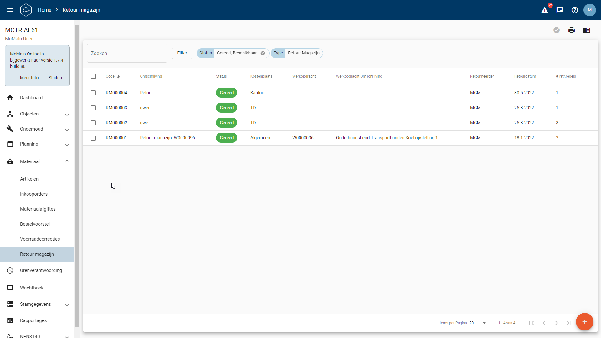 Op de pagina Retour magazijn is het mogelijk om uitgegeven materiaal retour te doen naar het magazijn.