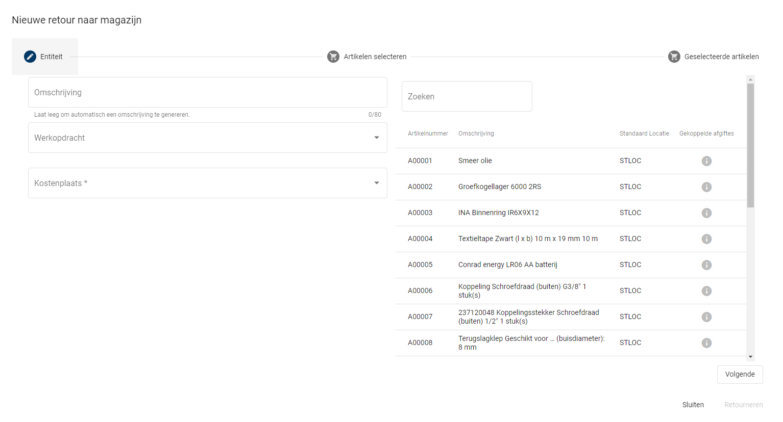Als er gekozen is voor een werkopdracht is het alleen mogelijk om materiaal te retourneren wat al is afgegeven, als er dus niets is afgegeven op die werkopdracht dan zal het systeem geen artikelen tonen. Als er enkel een kostenplaats geselecteerd is, dan zijn alle artikelen zichtbaar.