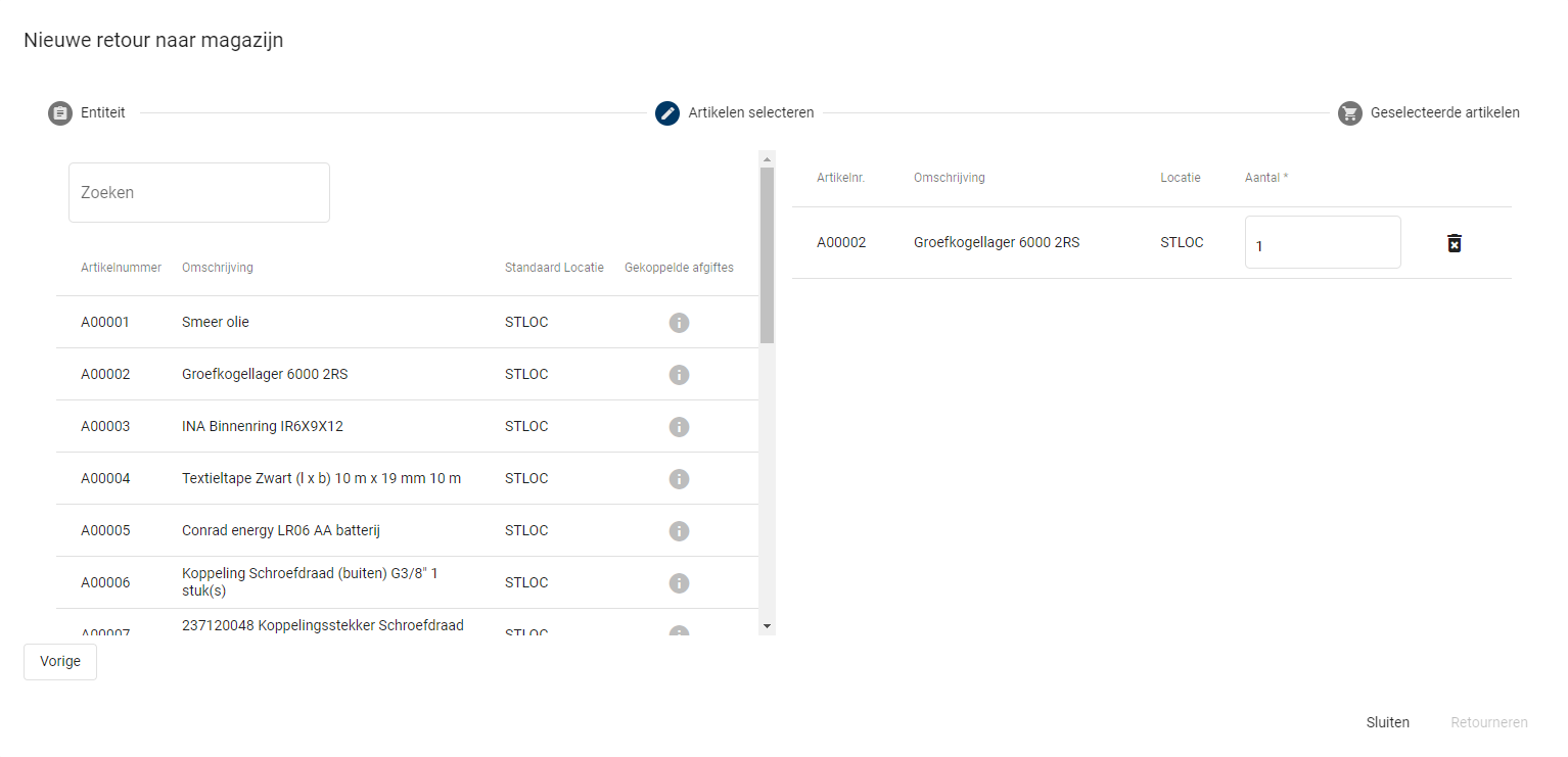 Wanneer artikelen die geretourneerd moeten worden geselecteerd gaan worden is het handig om eerst op de 'Volgende' knop te klikken, wat er dan getoond wordt is het volgende: