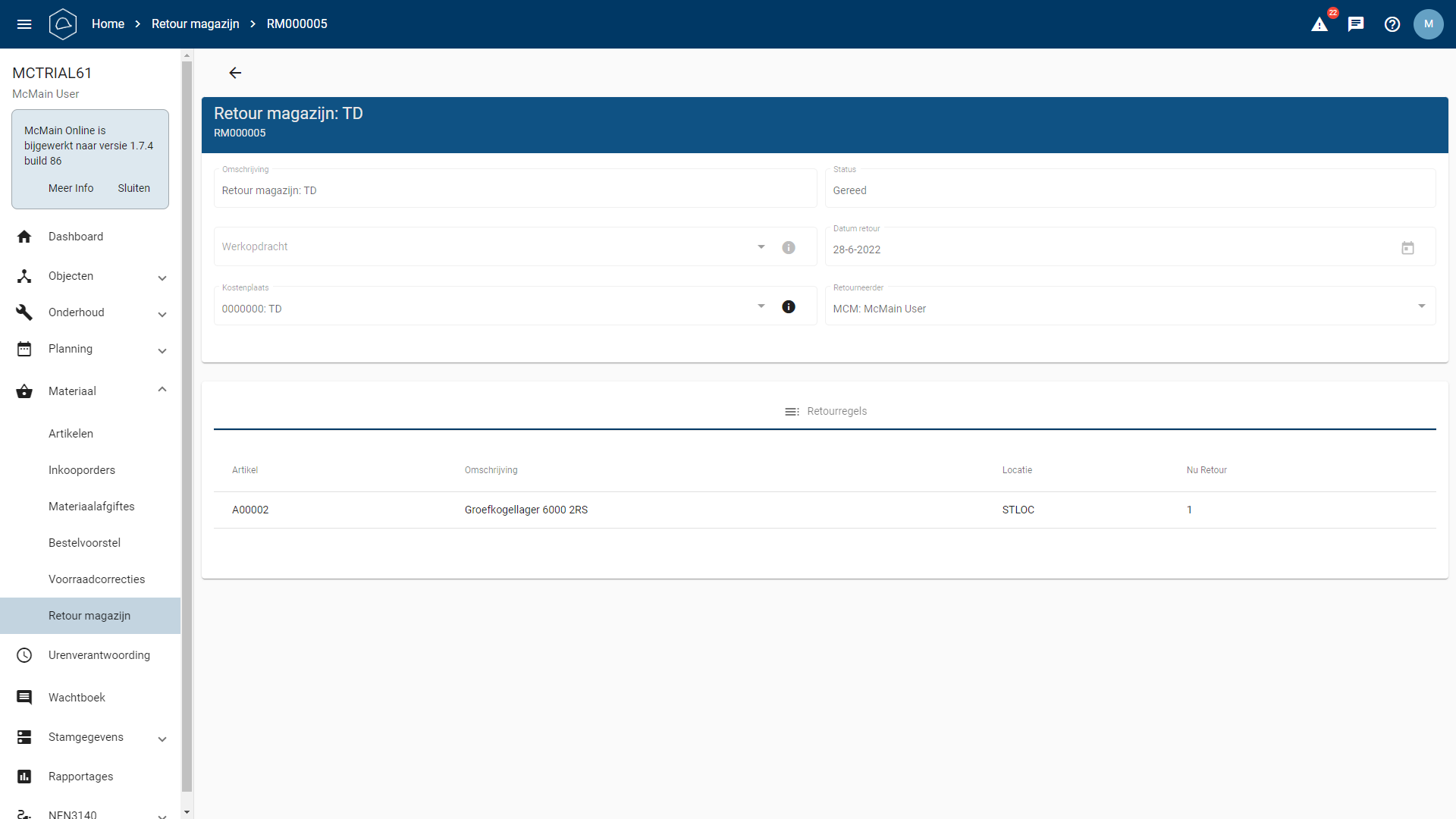 Hier is te zien wat er geretourneerd is, op welke datum dit gedaan is, wie het geretourneerd heeft en op welke werkopdracht of kostenplaats dit is uitgevoerd.