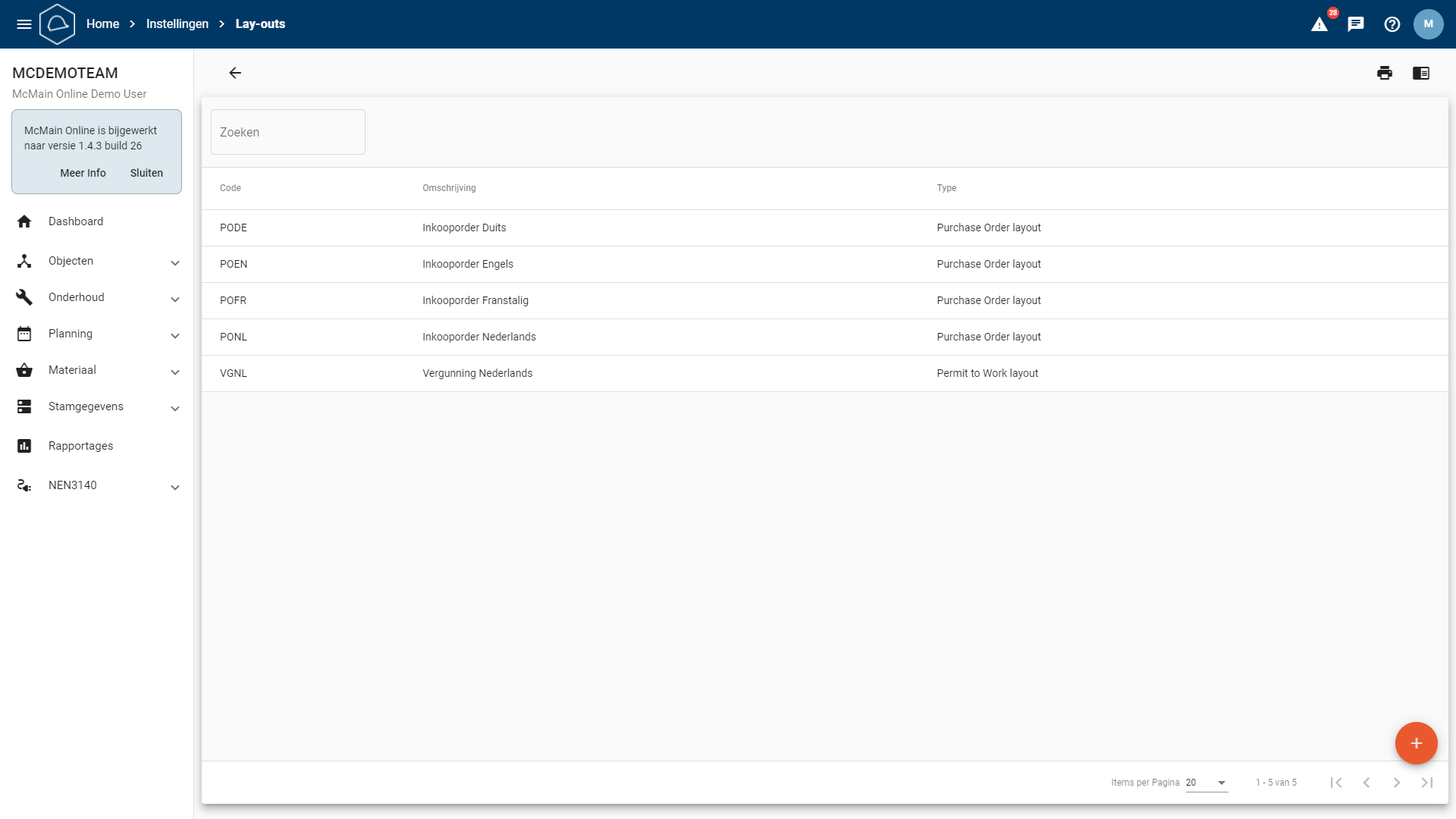 Beschikbare Lay-outs: McMain biedt standaard 4 lay-outs voor inkooporders in 4 verschillende talen: Duits, Engels, Frans en Nederlands.