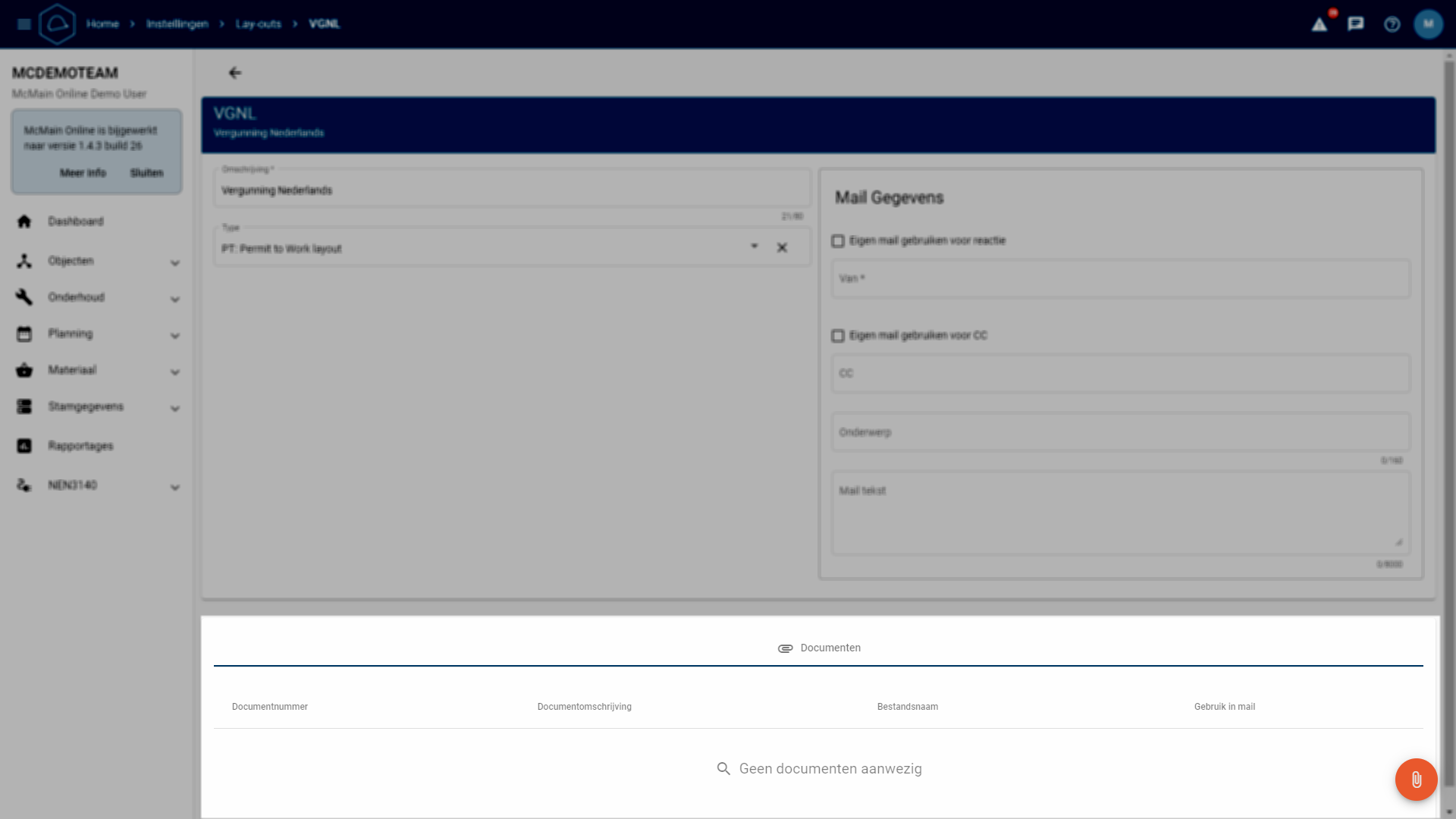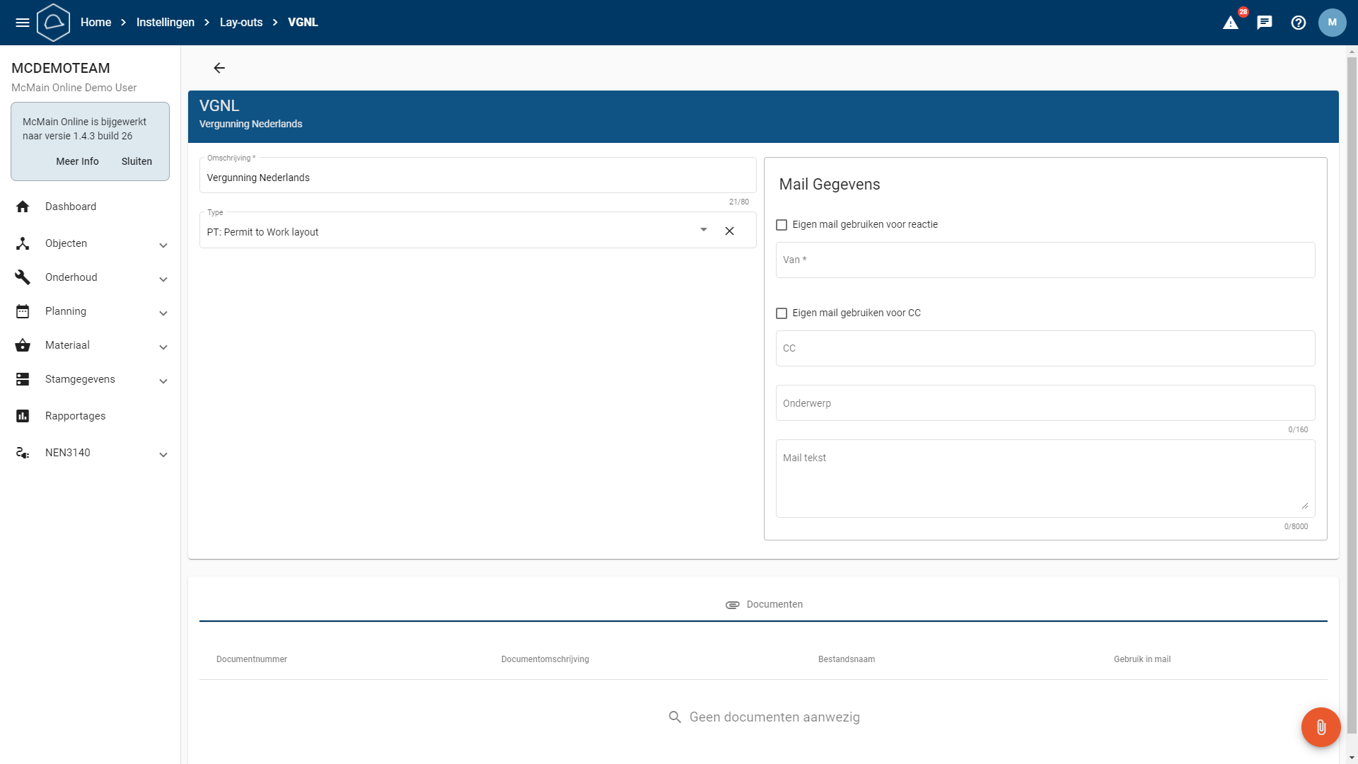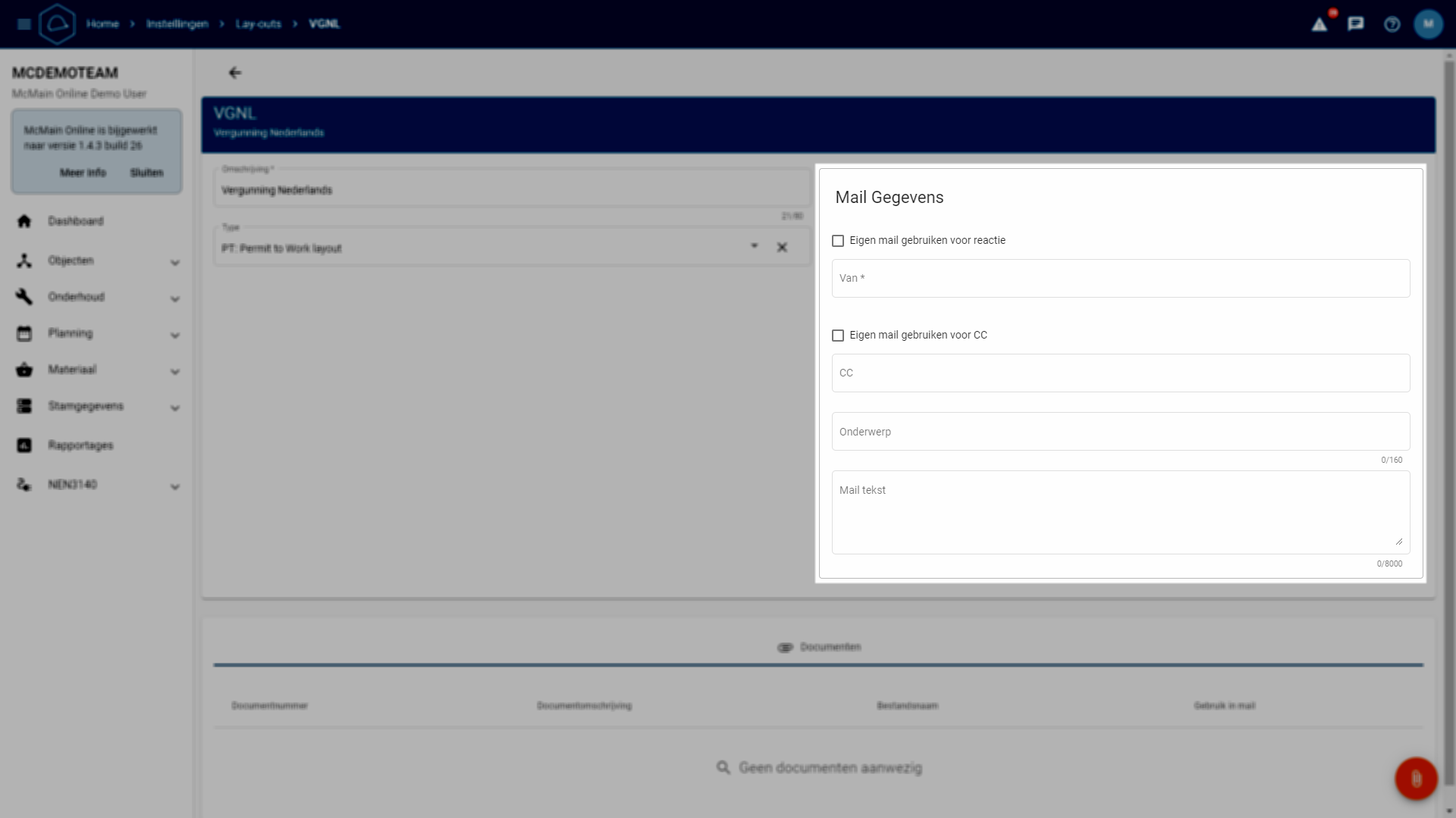 Mailgegevens: Nadat u een lay-out heeft gekozen, kunt u mailgegevens toevoegen. Standaard e-mailadressen kunnen worden ingevuld onder 'Mail Gegevens'. Deze kunnen ook worden ingevuld waar de lay-out wordt gebruikt. Hetzelfde geldt voor het onderwerp en de mailtekst.