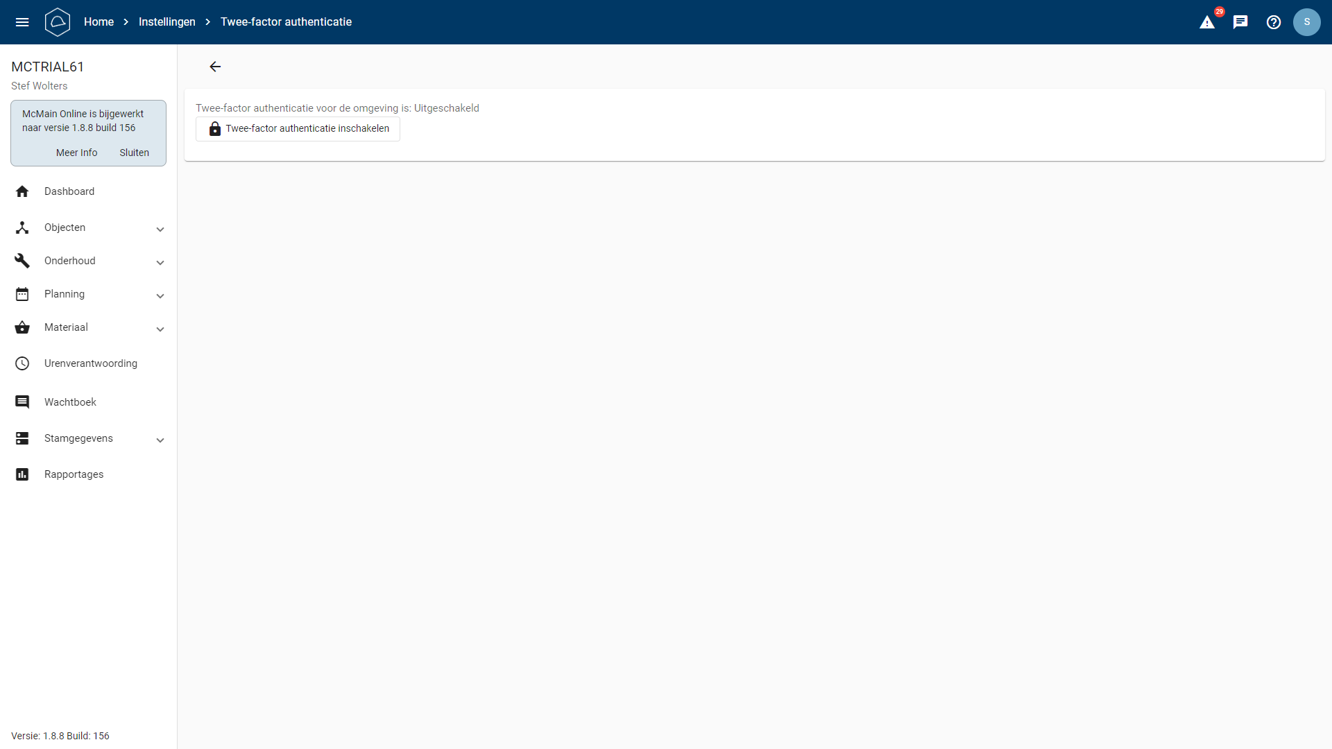 Stap 3: Open de pagina, klik op de knop ‘Twee-factor authenticatie inschakelen’. Voordat dit aangezet wordt, stellen we de vraag of je dat zeker weet, met een pop-up. U moet opnieuw inloggen en kunt de 2FA instellen. Iedereen die nu in McMain Online inlogt moet deze instellen.