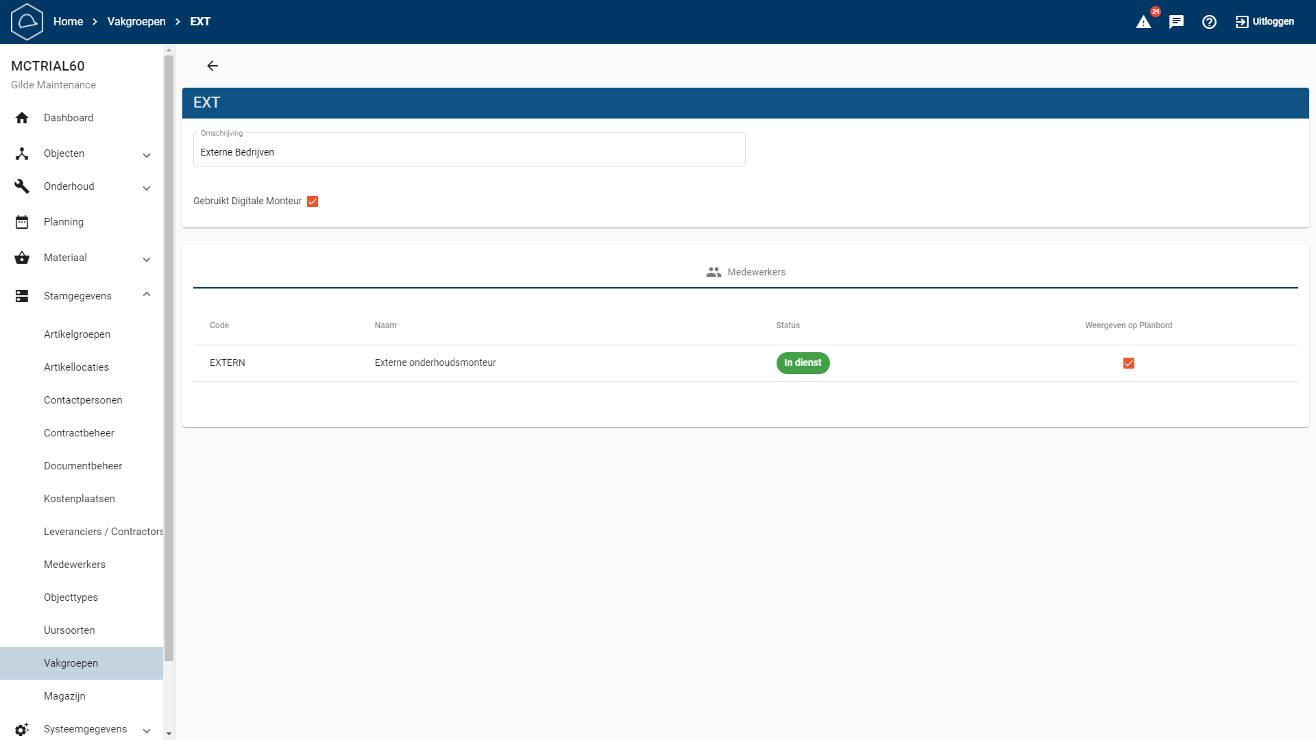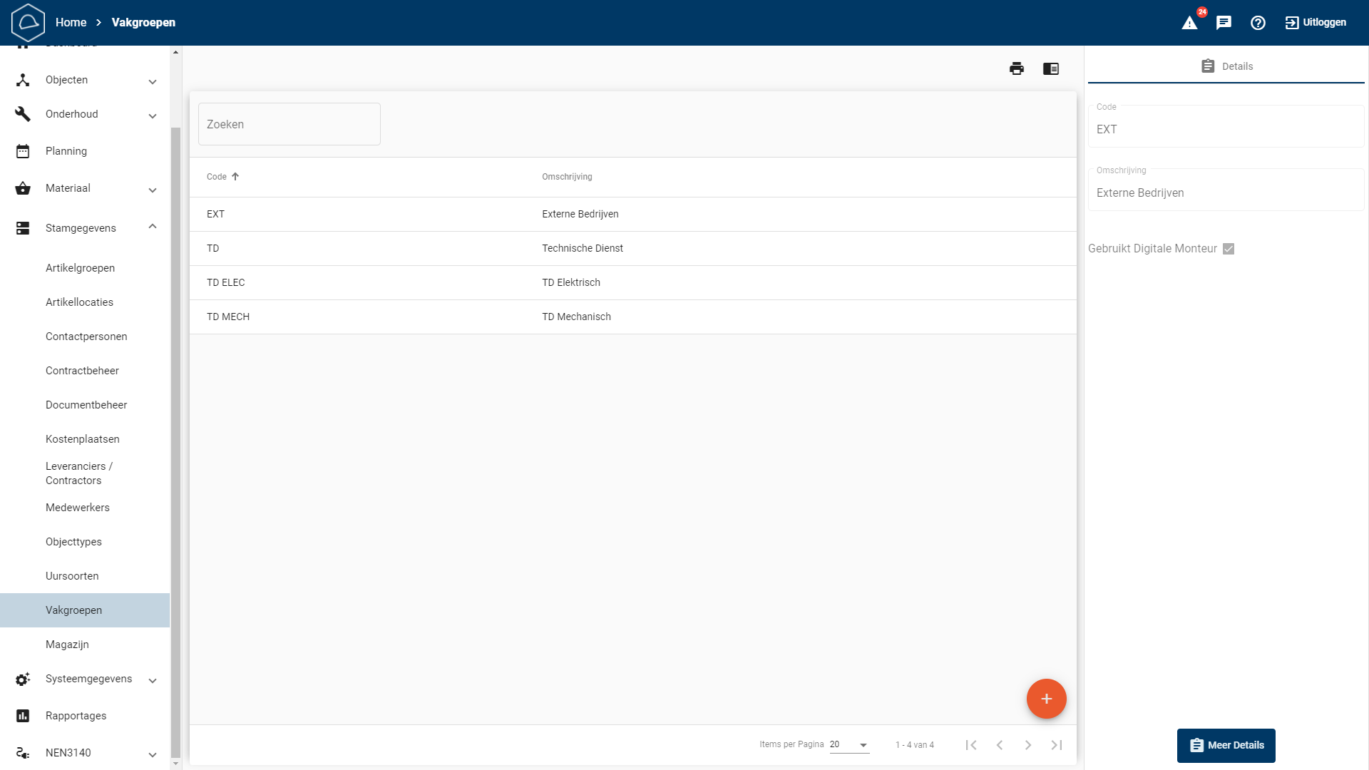 Vakgroepen kunnen gebruikt worden om een verdeling te maken tussen verschillende afdelingen en functies. Dit kan van pas komen op verschillende aspecten van de software, bijvoorbeeld het inplannen van werkopdrachten. Het is mogelijk om een werkopdracht te koppelen aan een vakgroep (bijvoorbeeld elektrische technische dienst), om op die manier de taak bij de gehele groep neer te leggen. Er kan genavigeerd worden naar ‘Vakgroepen’, door ‘Stamgegevens’ > ’Vakgroepen’. Hier is een overzicht van alle vakgroepen.