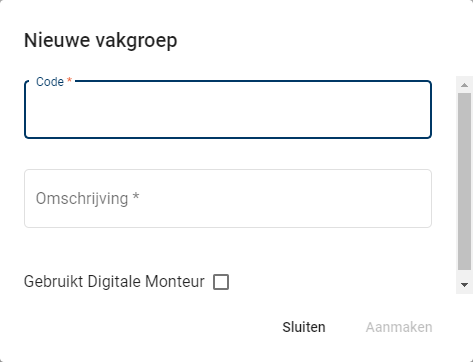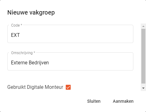 Bij het aanmaken van een nieuwe vakgroep dient een unieke vakgroep code en een vakgroep omschrijving worden ingevuld. Bij het aanmaken is het ook mogelijk om de optie Gebruikt Digitale Monteur aan te vinken.