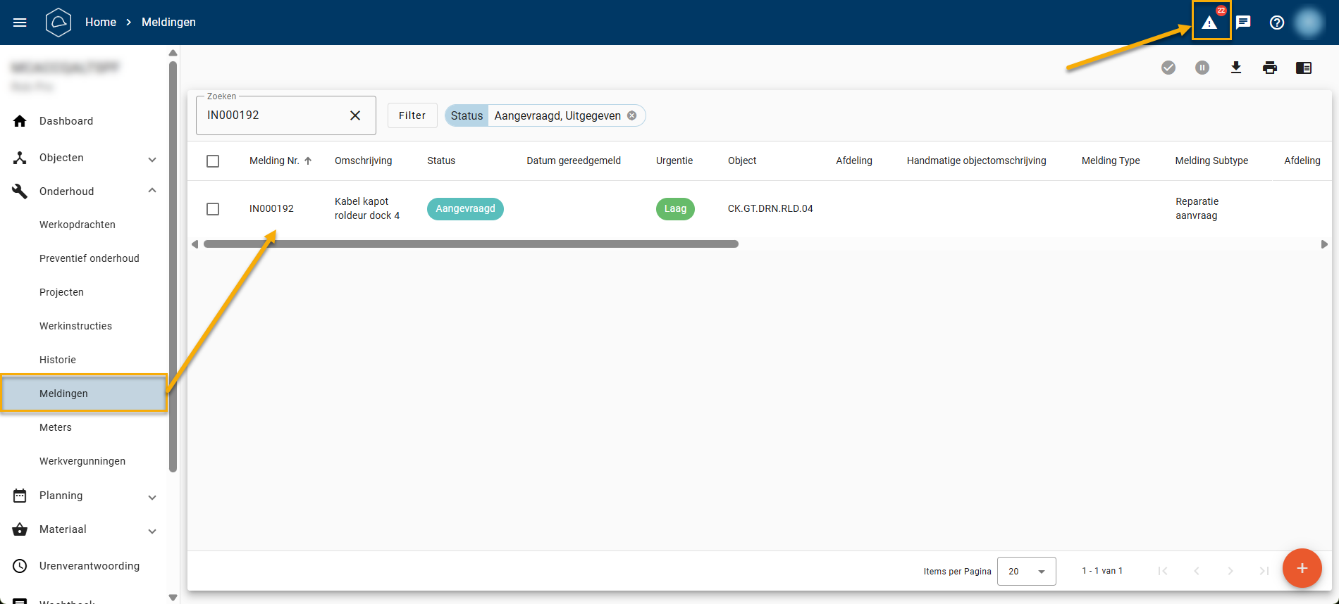Open de melding via het menu aan de linker zijde (Onderhoud > Meldingen) of klik op het driehoekige icoontje rechtsboven om een lijst met nieuw binnengekomen meldingen te zien.