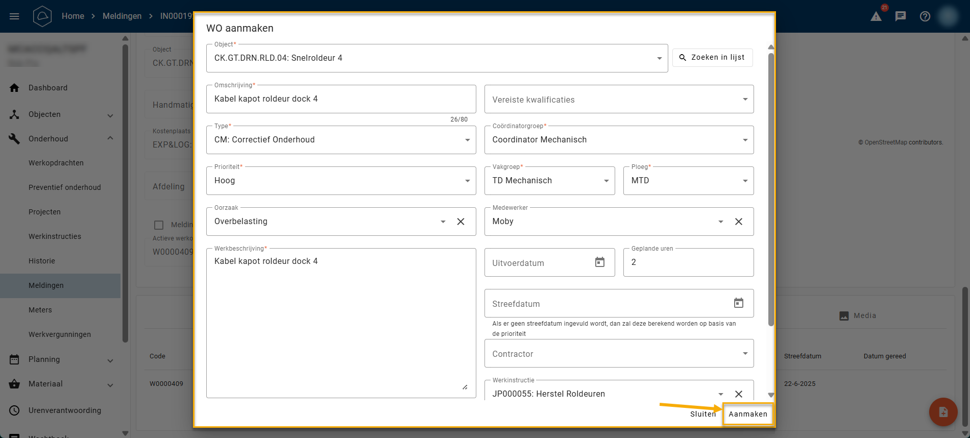 Vul alle relevante gegevens in, wijs de werkopdracht toe aan een monteur en maak de werkopdracht aan met de Aanmaken knop rechtsonder
