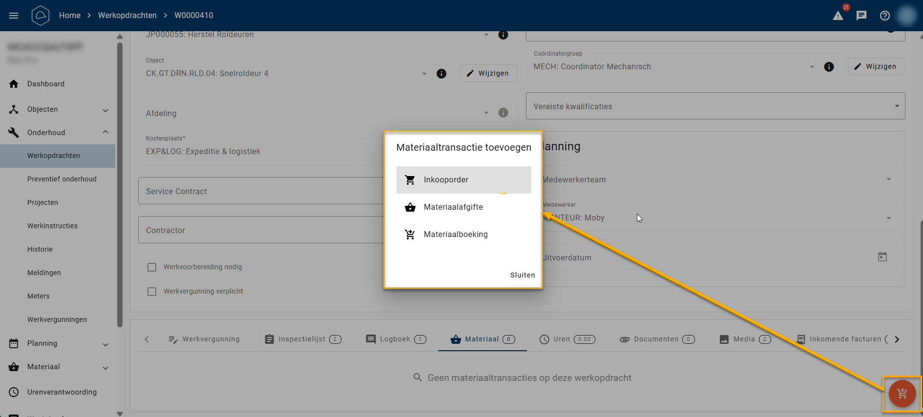 Scroll naar beneden, selecteer het tabblad Werkopdracht, klik op de oranje actieknop rechtsonder en selecteer Storing of Werkopdracht (In dit voorbeeld kiezen we de optie Werkopdracht)