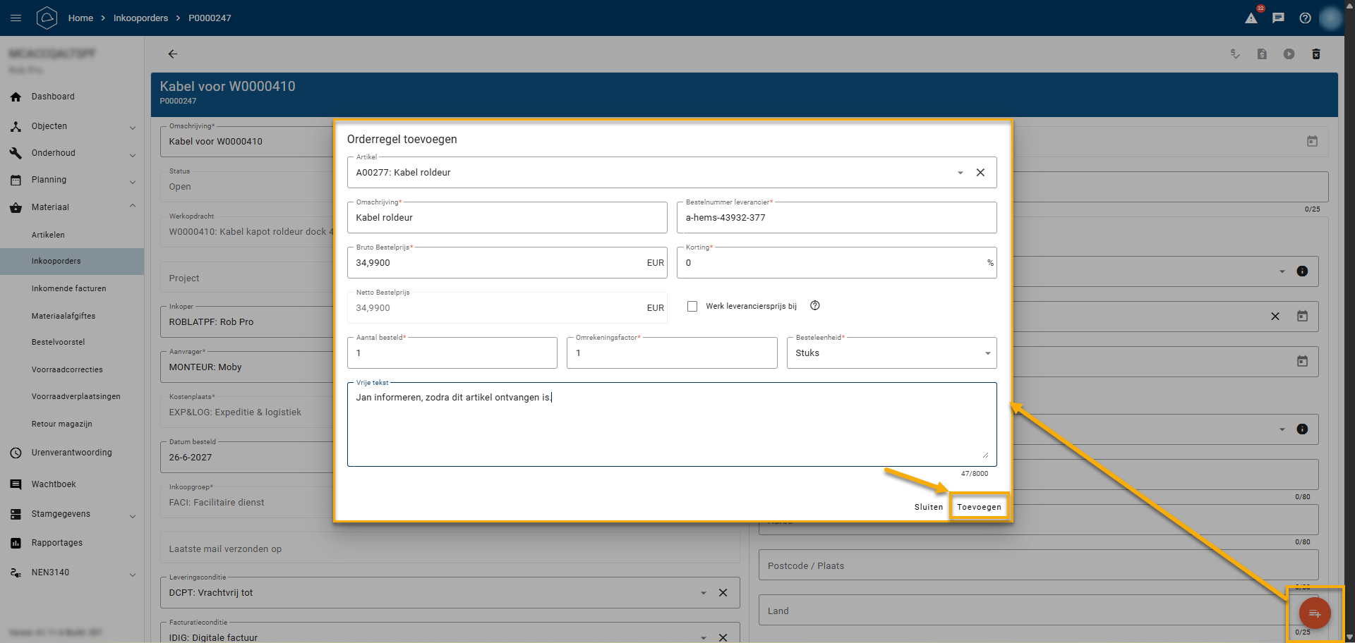 Klik op de oranje actieknop rechtsonder, selecteer het artikel dat besteld moet worden in de geopende popup Orderregel toevoegen, vul waar relevant de overige velden in en klik op de knop Toevoegen. Herhaal deze stap voor ieder artikel dat je wilt bestellen, gerelateerd aan de werkopdracht.