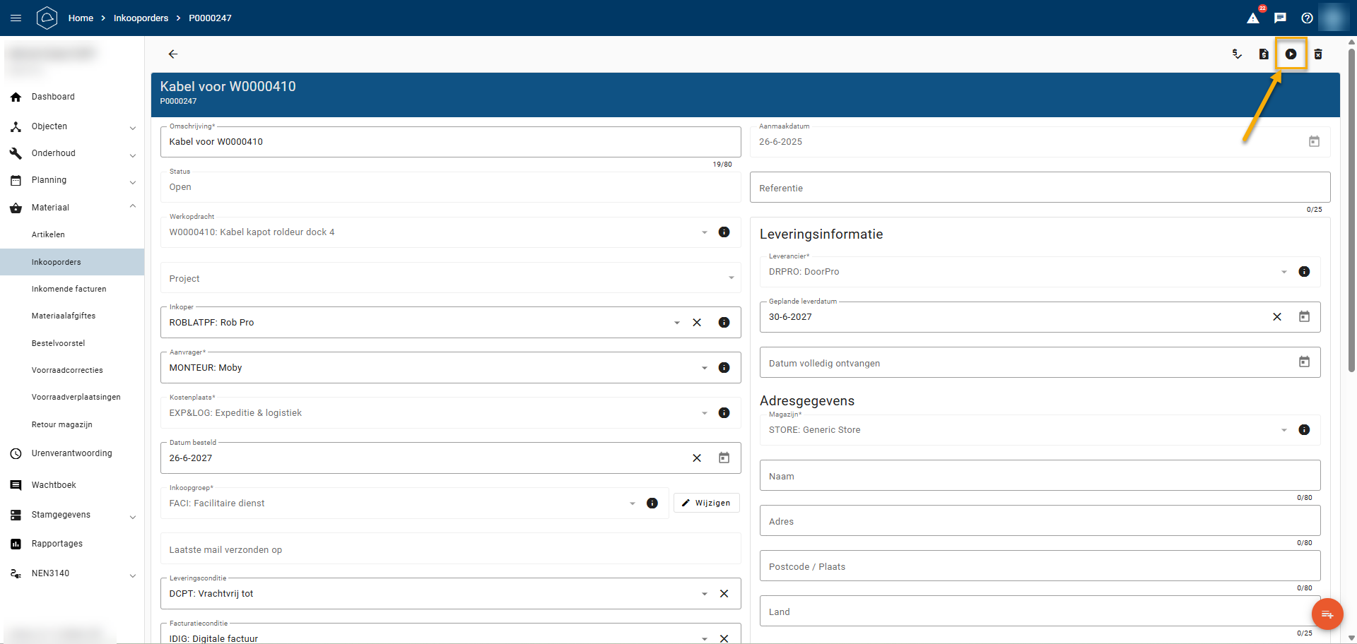 Selecteer onderaan op de werkopdracht het tabblad Materiaal en klik op de oranje actieknop en selecteer de optie Inkooporder