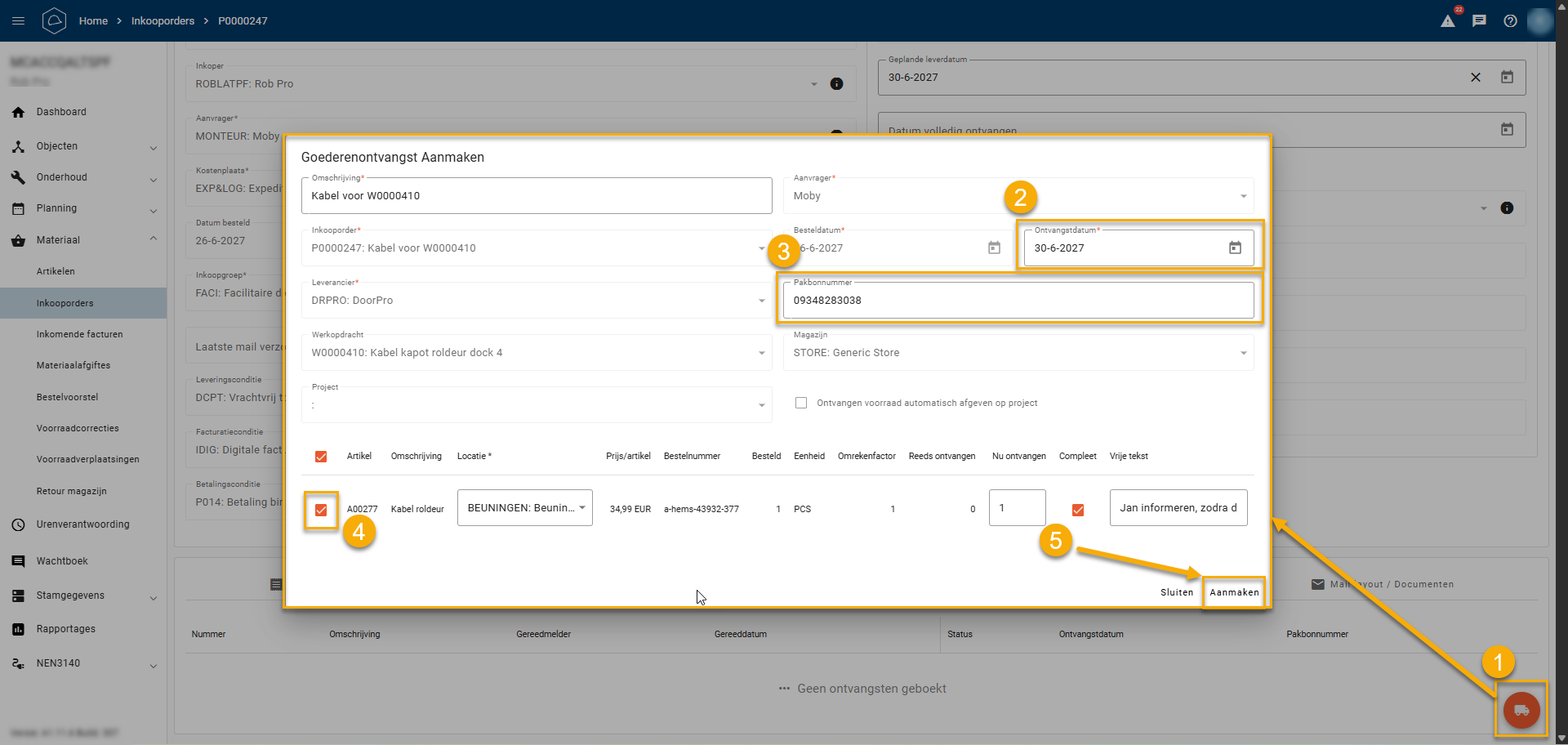 Vul de relevante gegevens in voor ontvangstdatum en pakbonnummer.