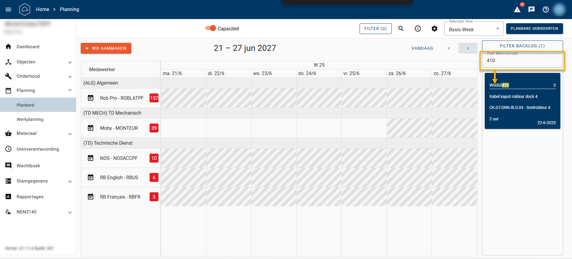 Zoek rechts, boven de backlog, in het veld Zoek Werkvoorraad naar de werkopdracht die in de vorige stappen is aangemaakt