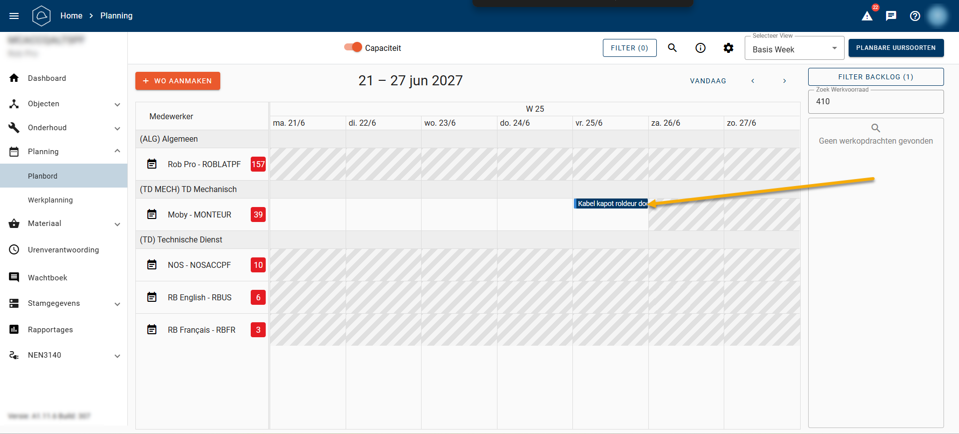 Sleep de werkopdracht vanuit de backlog rechts het planbord in op de dag dat de uitvoerder van het werk de het werk gaat uitvoeren