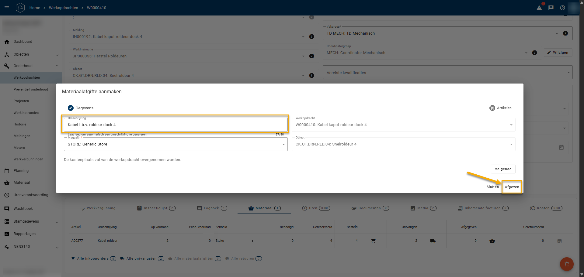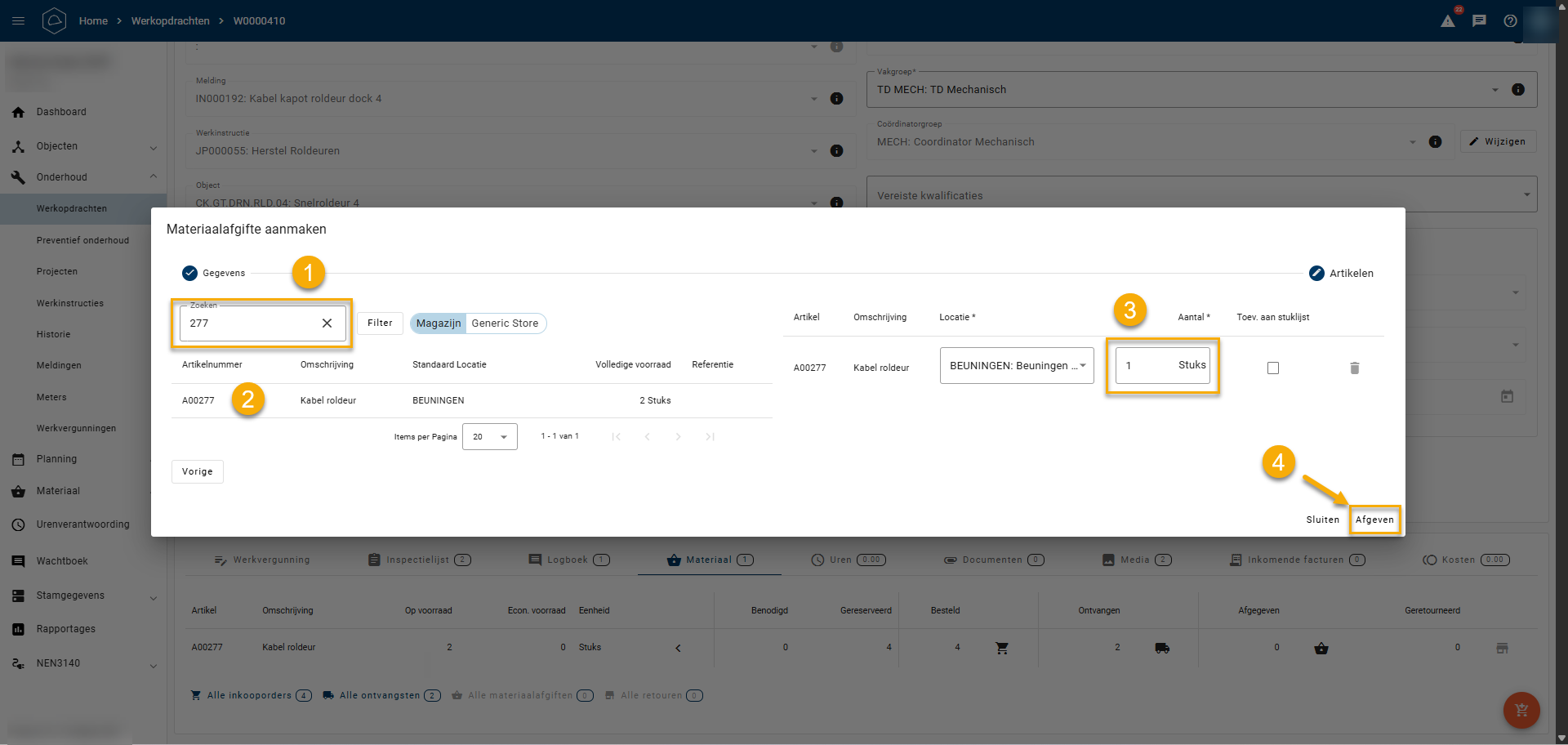 Afgifte van materiaal kan zowel in McMain Online als in de Digitale Monteur afgehandeld worden. In dit voorbeeld zullen we een materiaalafgifte doen vanuit McMain Online.
