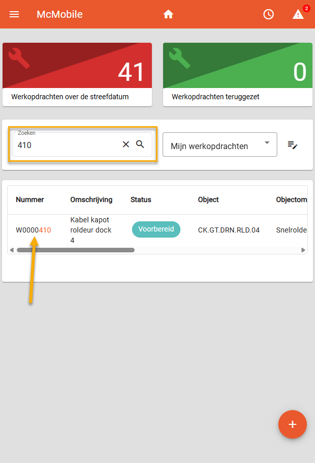 Zoek op bijvoorbeeld het werkopdracht nummer, het object nummer of een sleutelwoord in de omschrijving van de werkopdracht.