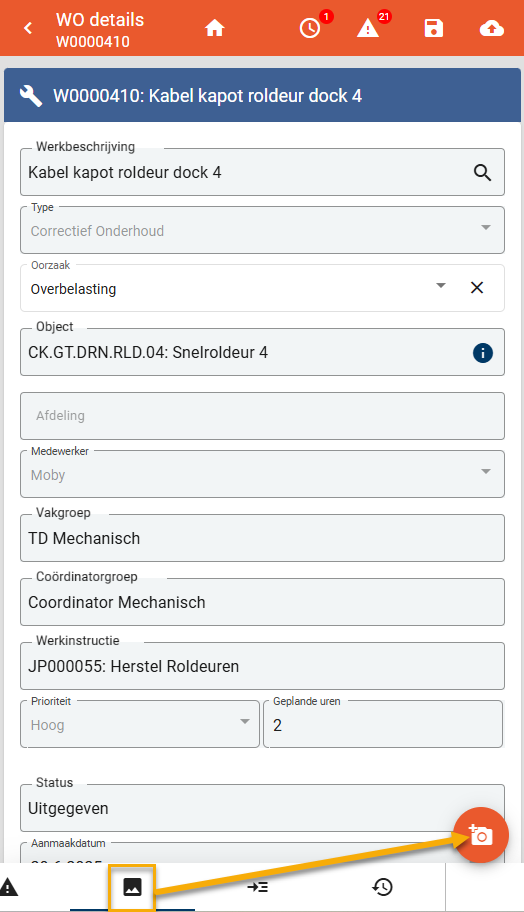 De monteur kan zijn werk uitvoeren. Zodra het werk uitgevoerd is kunnen de details met betrekking tot het werk aan de werkopdracht worden toegevoegd. Er kan bijvoorbeeld een foto worden toegevoegd nadat het werk uitgevoerd is, door de tabbladen balk onder in het scherm te swipen naar links, zodat de andere tabbladen zichtbaar worden.