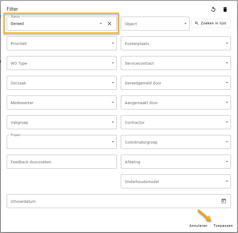 Filter op status Gereed via de Filter knop rechts naast het zoekveld.