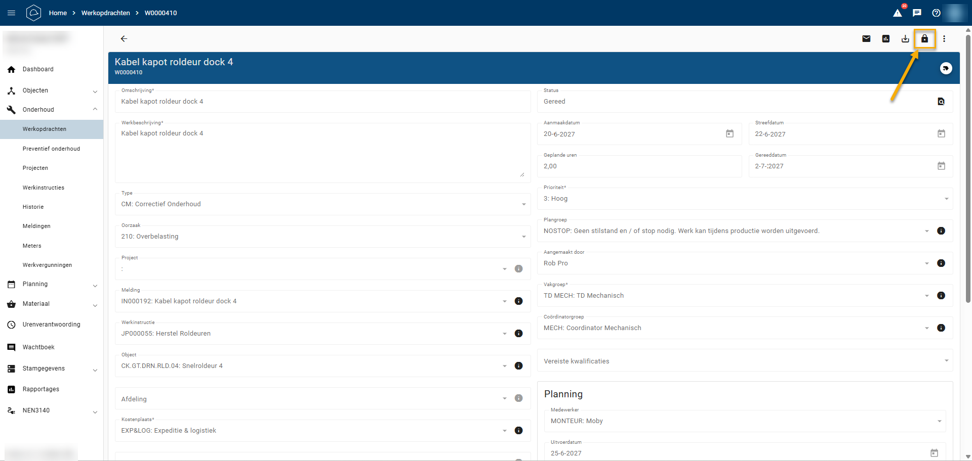 Zodra alle relevante informatie aan de werkopdracht is toegevoegd kan de werkopdracht gereedgemeld worden door rechtsboven op