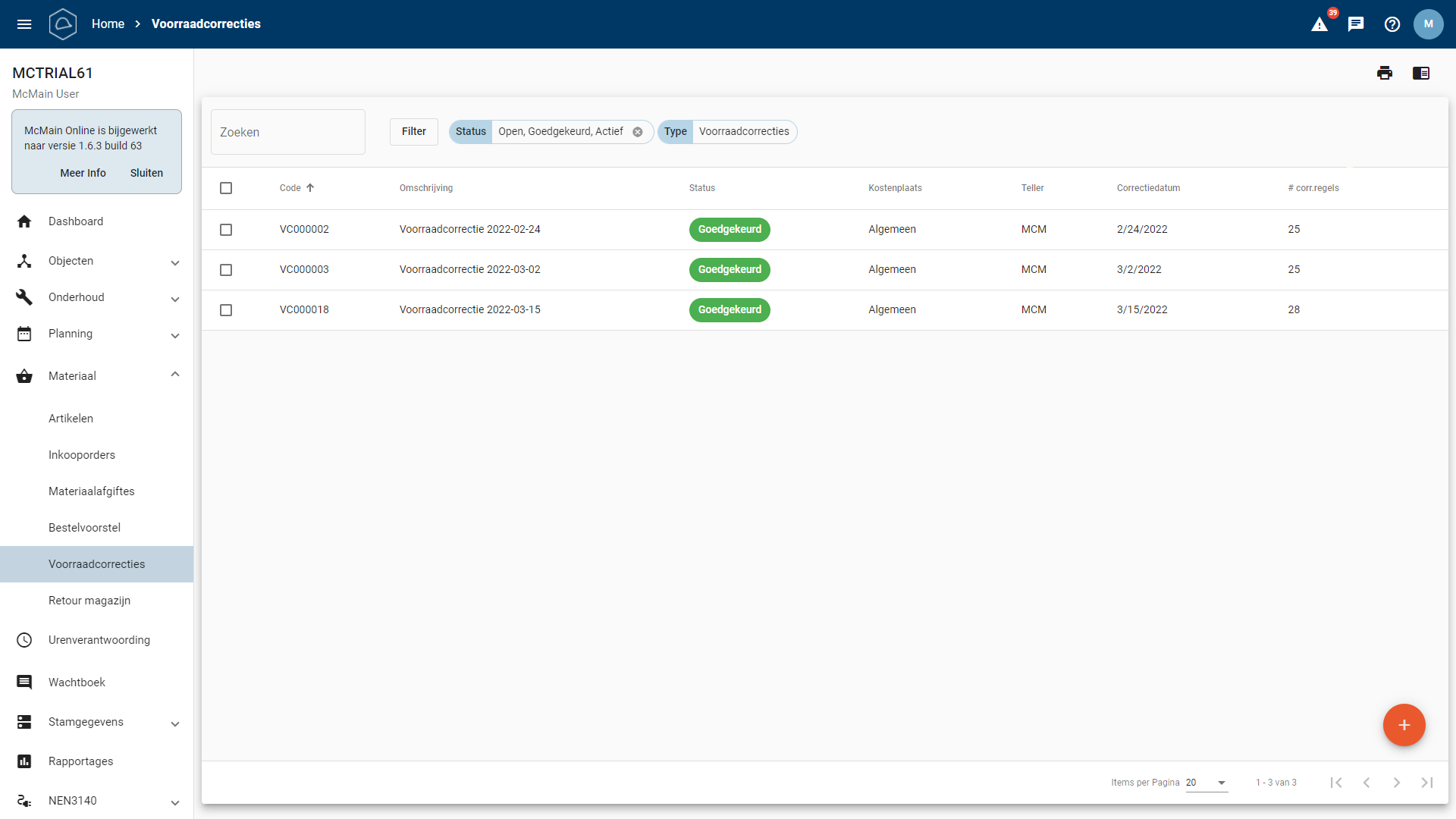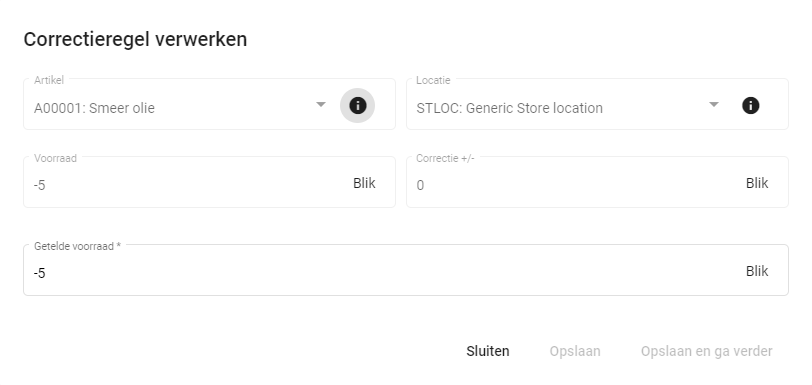 Klik op de oranje actie-knop rechts onderin het scherm. Het scherm ‘Nieuwe voorraadcorrectie’ verschijnt.