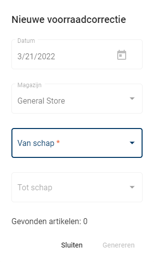 Klik op de oranje actie-knop rechts onderin het scherm en vul de verplichte velden in het scherm ‘Nieuwe voorraadcorrectie’ in. Klik op 'Genereren' om de lijst aan te maken.