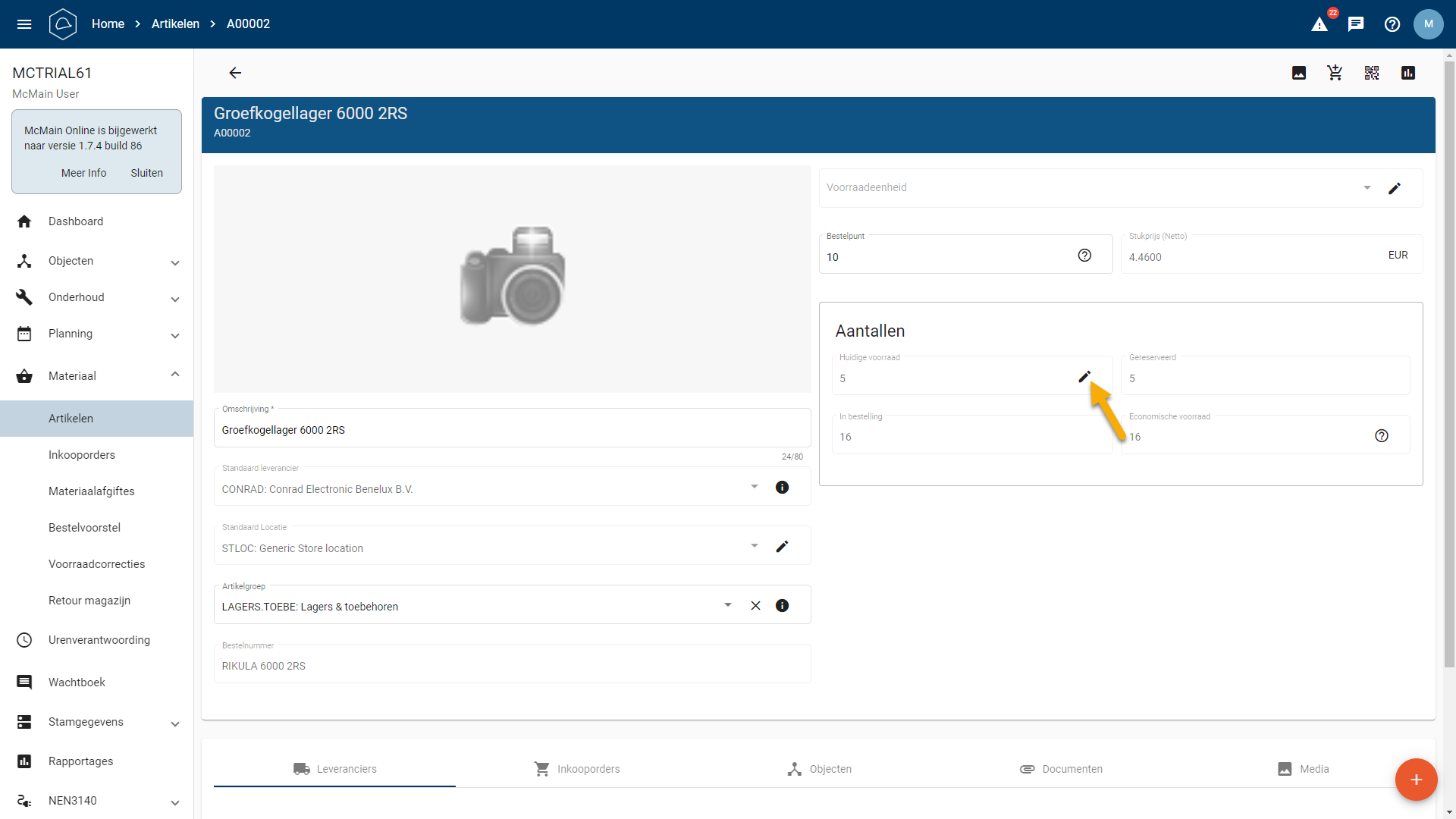 Een andere manier om de voorraad te corrigeren is bij het artikel zelf. Op het detailscherm van een artikel kan dit worden gedaan door op het pennetje achter 'Huidige voorraad' onder ‘Aantallen’ te klikken.