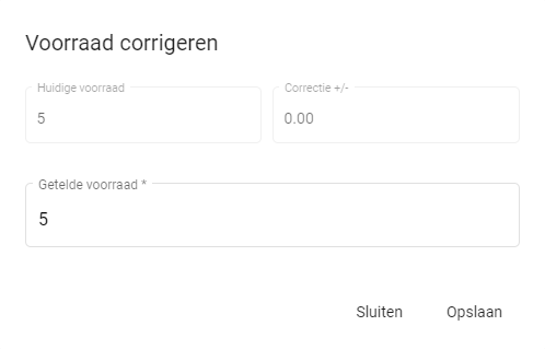De ‘Voorraad corrigieren’ pop-up komt dan naar voren met de invulvelden: Huidige voorraad, Getelde voorraad* en Correctie+/-. De invulvelden met ‘*’ zijn verplichte invulvelden.