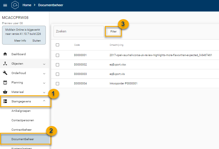In het Documentenbeheer kan vanaf nu ook gefilterd worden om documenttypes, op aanmaakdatum en verlopen documenten ((1) Menu -> Stamgegevens -> (2) Documentbeheer -> (3) Filter).