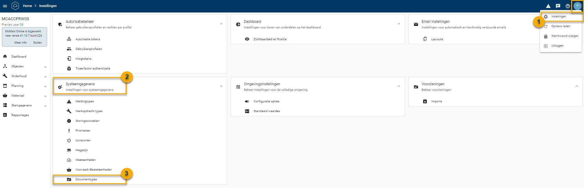 In het Documentbeheer is het mogelijk om gebruik te maken van Documenttypes. Een overzicht van de Documenttypes is te vinden via ((1) Profiel -> Instellingen -> (2) Systeemgegevens -> (3) Documentbeheer).