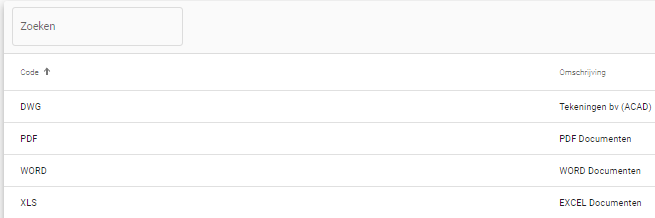 Er zijn al een aantal Documenttypes beschikbaar: DWG (tekeningen bv (ACAD)), PDF (PDF documenten, WORD (WORD documenten) en XLS (EXCEL documenten). Je kunt eenvoudig een document toevoegen door op de oranje '+' actieknop te klikken.