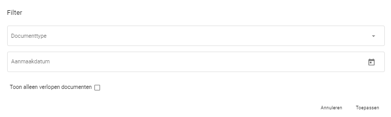 Door op de filterknop te klikken kunnen de filters toevoegen. Filter 'Documenttype' geeft een drop-down van alle documenttypes. Bij de filter 'Aanmaakdatum' kan je zelf de gewenste data selecteren. Selecteer je het vakje naast 'Toon alleen verlopen documenten', krijgt dit vakje een oranje vinkje en worden alle verlopen documenten weergegeven.