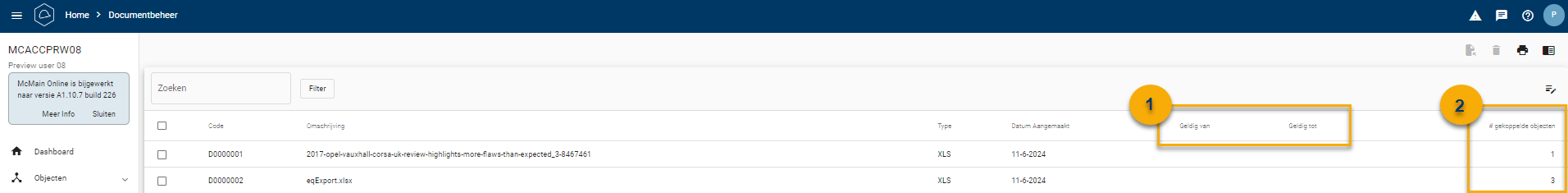 Hier zien we de twee nieuwe kolommen: (1) Geldig van/tot (Datum) en (2) Aantal gekoppelde objecten.