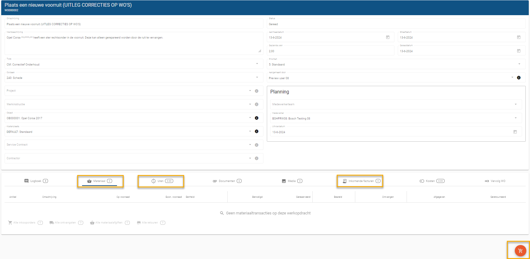 In bovenstaande Werkopdracht zien we de tabbladen gemarkeerd. Je kunt onder deze tabbladen nog data toevoegen door op de oranje actieknop links onderin het beeldscherm te klikken.