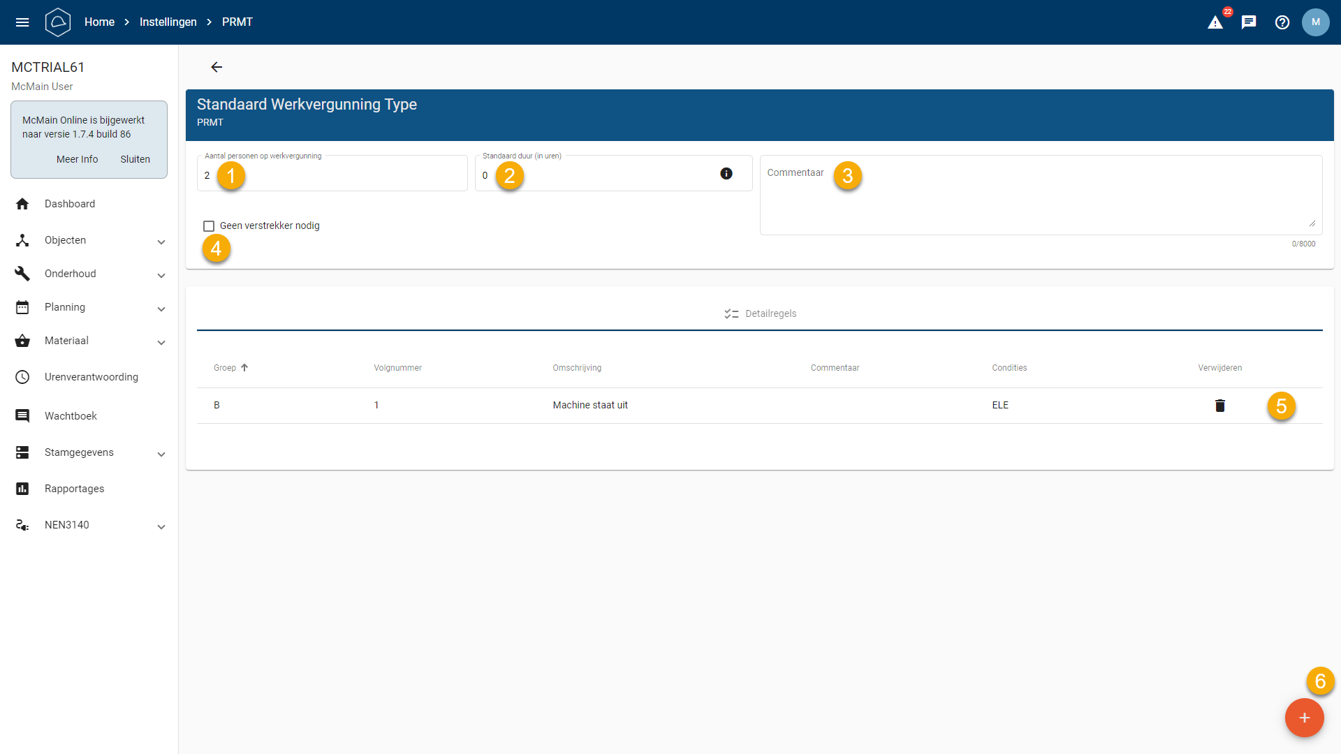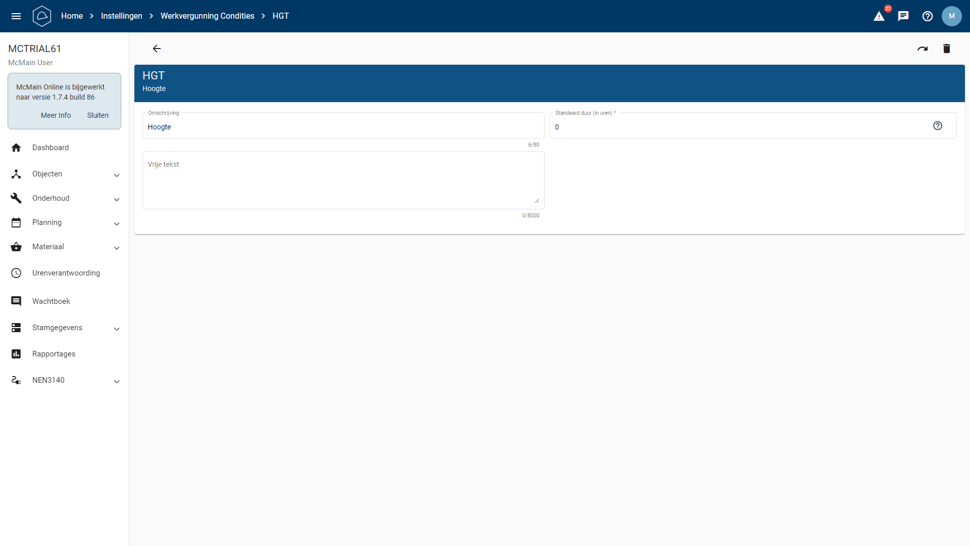 Op het detail scherm kun je de omschrijving van de conditie aanpassen, je kan een aantal uren instellen. Als deze conditie dan aanwezig is op een werkvergunning en de duur (in uren) is korter dan die op de werkvergunning zal deze prioriteit krijgen over de geldigheid van de werkvergunning.