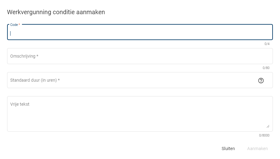 Er moet een code worden ingevuld, deze dient uniek te zijn. Een omschrijving is nodig, hier kan aangegeven worden wat voor conditie het is. De standaard duur moet ingevuld worden, let op, dit moet in uren.